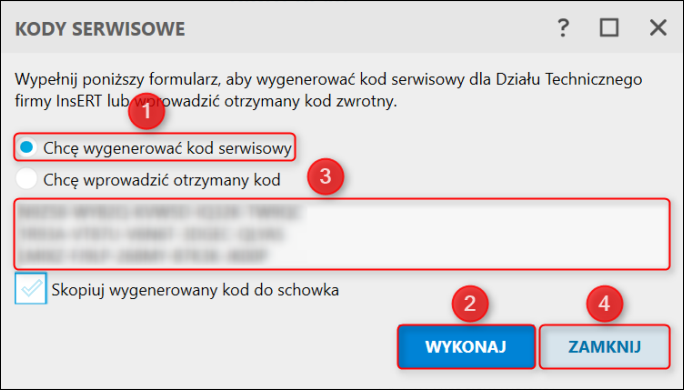 3. Wybrać opcję Chcę wygenerować kod serwisowy i kliknąć Wykonaj. Tak wygenerowany Kod serwisowy skopiować do schowka i wyjść z okna, wybierając Zamknij.
