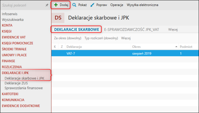 1. Przejść do modułu Deklaracje i JPK – Deklaracje skarbowe i JPK, a następnie wybrać z górnego menu Dodaj – Deklaracja skarbowa.