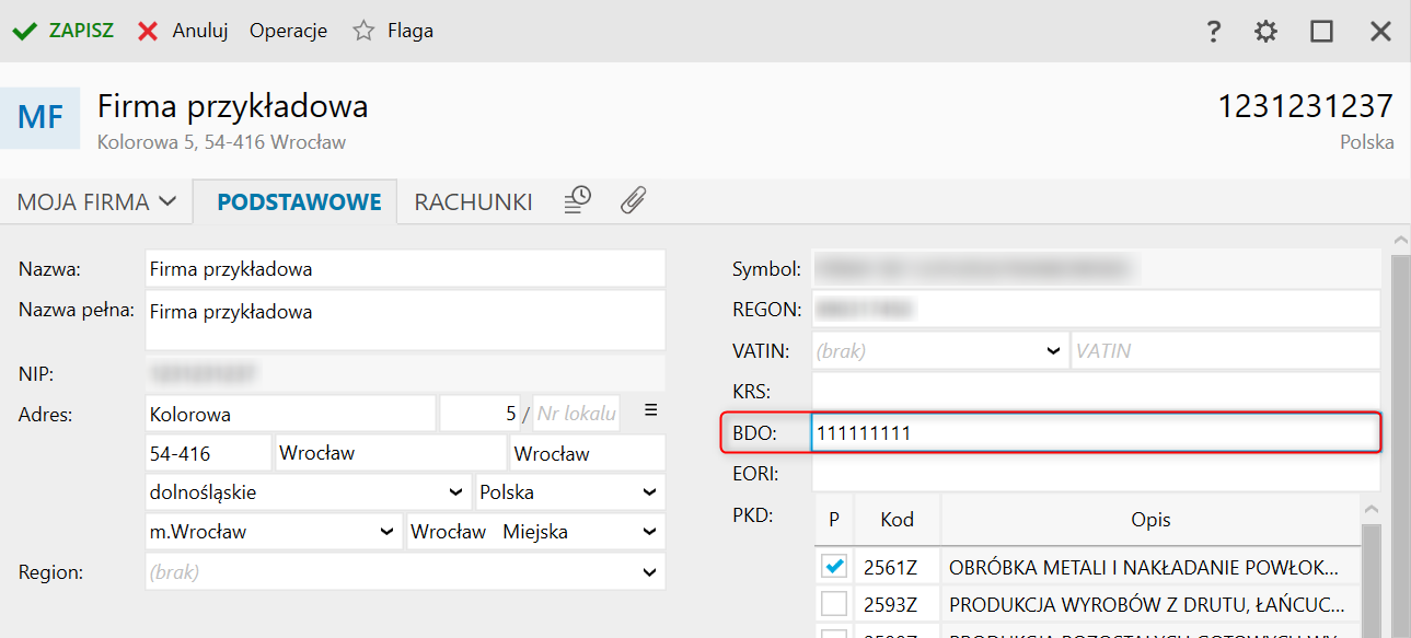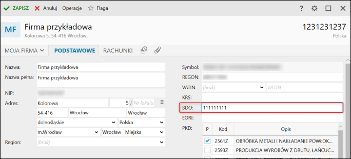 Aby umieścić numer BDO (numer w Bazie Danych o Odpadach) na wydruku dokumentu, należy wprowadzić go danych firmy oraz sprawdzić, czy jego wydruk jest włączony w używanym wzorcu wydruku. W tym celu należy: