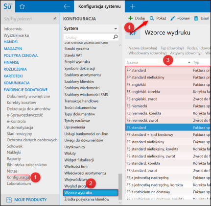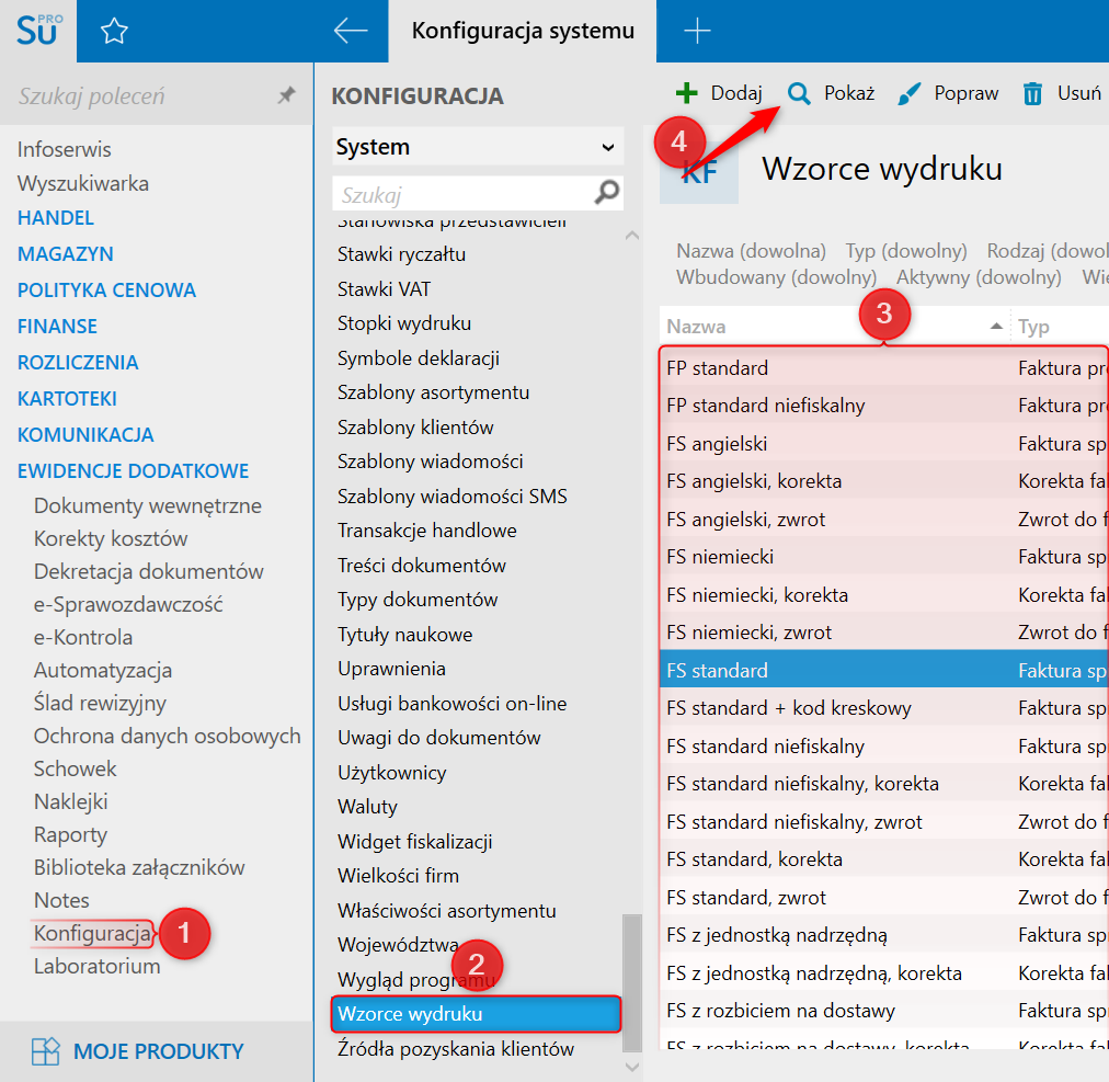 1. Przejść do modułu Konfiguracja – Wzorce wydruku, zaznaczyć odpowiedni wzorzec i kliknąć Pokaż.
