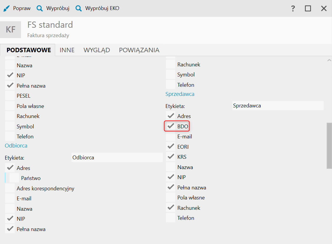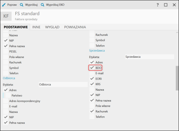 2. Parametr odpowiadający za wydruk numeru BDO znajduje się w sekcji Sprzedawca. Jeśli parametr nie jest zaznaczony, należy przejść do edycji wzorca, zaznaczyć parametr i zapisać zmiany.