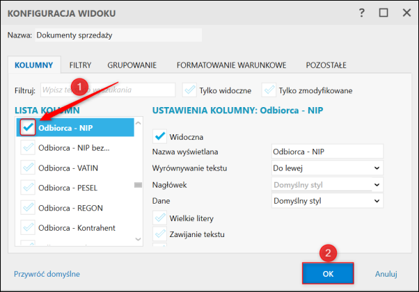 2. W oknie, które się wyświetli w sekcji Lista kolumn zaznaczyć Odbiorca - NIP. Zmiany zapisać przyciskiem OK.