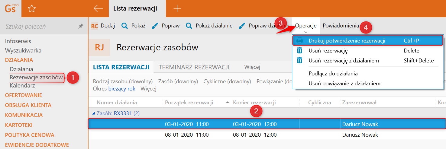 Aby to zrobić, należy przejść do modułu Rezerwacje zasobów, zaznaczyć rezerwacje, rozwinąć górne menu Operacje i wybrać Drukuj potwierdzenie rezerwacji.