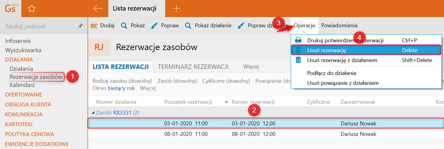 Aby to zrobić, należy przejść do modułu Rezerwacje zasobów, zaznaczyć rezerwacje, rozwinąć górne menu Operacje i wybrać Usuń rezerwację.