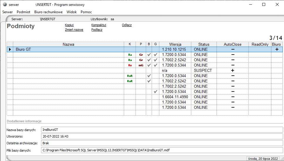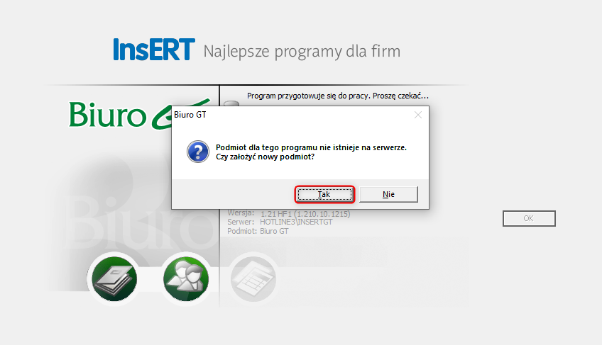 Jeżeli wykorzystano okres próbny dla Biura GT, istnieje możliwość usunięcia starego podmiotu przy użyciu Programu Serwisowego (znajduje się w menu Start – InsERT – Program serwisowy), a następnie założenia nowego zgodnie z powyższą instrukcją.