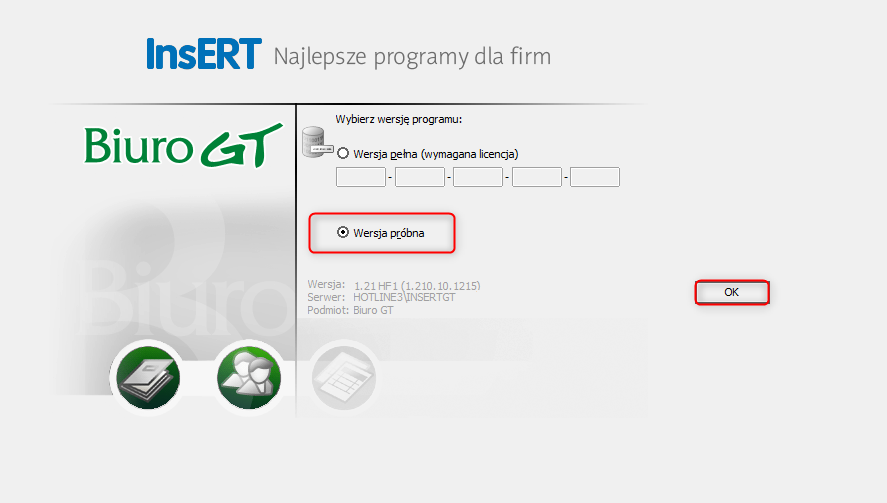 Program Biuro GT umożliwia skorzystanie z wersji próbnej podmiotu, który będzie aktywny przez 45 dni od uruchomienia. Aby założyć podmiot próbny w Biurze GT, należy: