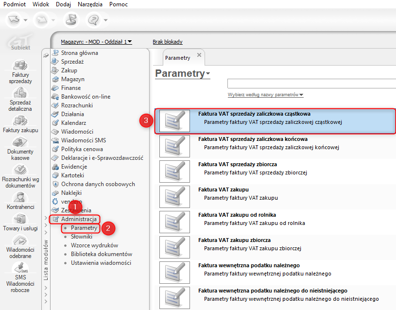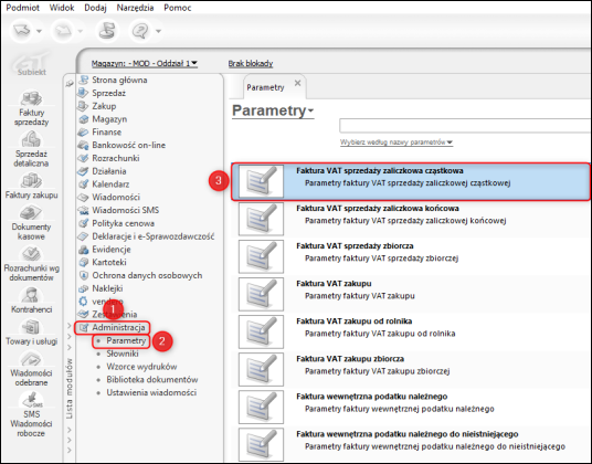 1. Przejść do modułu Administracja – Parametry i otworzyć Faktura VAT sprzedaży zaliczkowa cząstkowa.