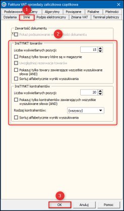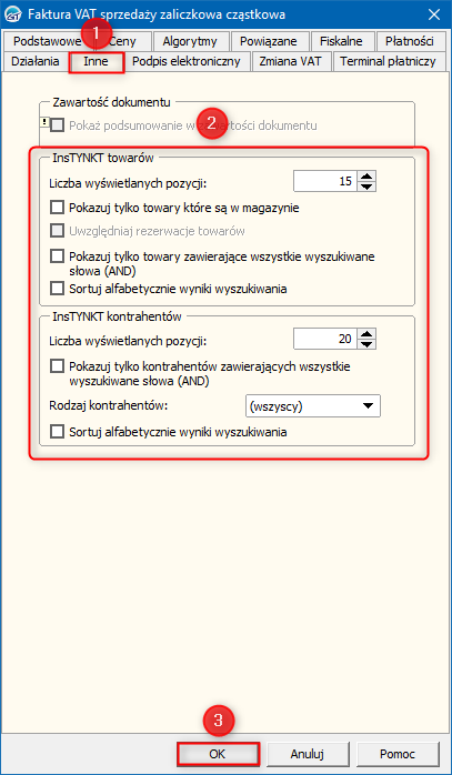 InsTYNKT to mechanizm wyszukiwania asortymentu i kontrahentów (w przypadku faktur sprzedaży) w bazie, pozwalający ograniczyć korzystanie z pełnych list dostępnych pod przyciskiem F2. Aby zmienić konfigurację dla faktur VAT sprzedaży zaliczkowych cząstkowych, należy: