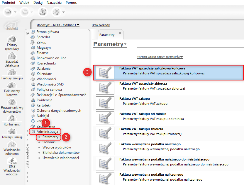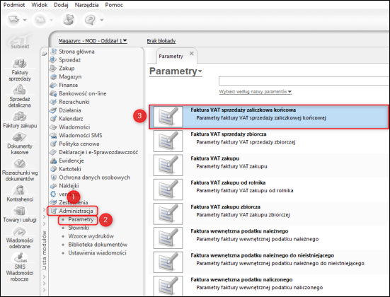 1. Przejść do modułu Administracja – Parametry i otworzyć Faktura VAT sprzedaży zaliczkowa końcowa.