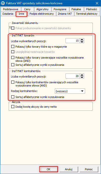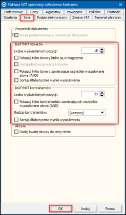 InsTYNKT to mechanizm wyszukiwania asortymentu i kontrahentów (w przypadku faktur sprzedaży) w bazie, pozwalający ograniczyć korzystanie z pełnych list dostępnych pod przyciskiem F2. Aby zmienić konfigurację dla faktury sprzedaży zaliczkowej końcowej, należy:
