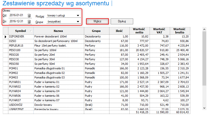 Aby wyliczyć zestawienie prezentujące sprzedaż wg asortymentu w wybranym okresie, należy: