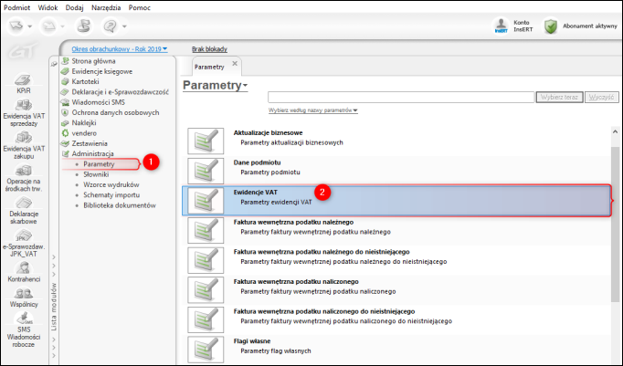 1. Przejść do modułu Administracja – Parametry – Ewidencje VAT.