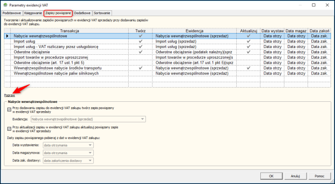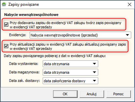 Wyłączyć aktualizację dat dla zapisów powiązanych (Przy aktualizacji zapisu w ewidencji VAT zakupu aktualizuj zapis w ewidencji VAT sprzedaży), co pozwoli na wprowadzenie różnych dat naliczenia/odliczenia.