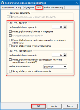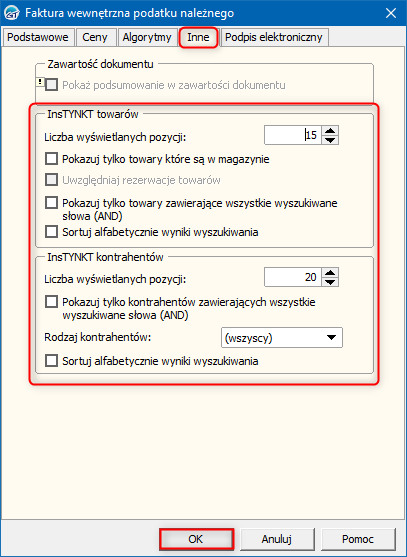 InsTYNKT to mechanizm wyszukiwania asortymentu i kontrahentów (w przypadku faktur wewnętrznych) w bazie, pozwalający ograniczyć korzystanie z pełnych list dostępnych pod przyciskiem F2. Aby zmienić konfigurację dla faktury wewnętrznej podatku należnego, należy:
