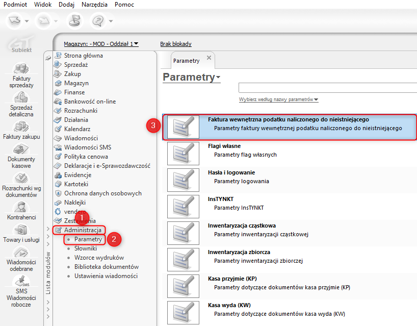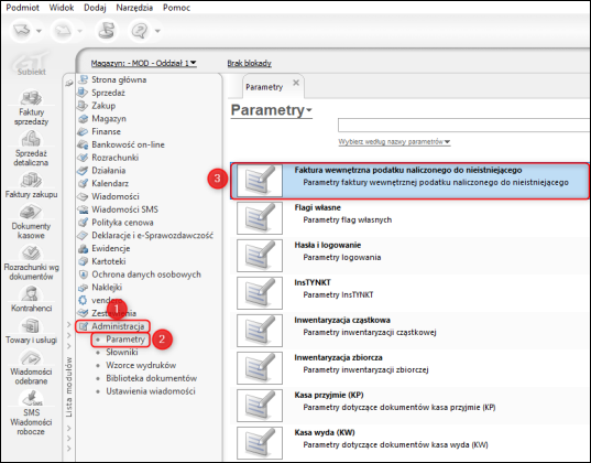 1. Przejść do modułu Administracja – Parametry i otworzyć Faktura VAT podatku naliczonego do nieistniejącego.