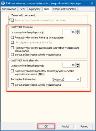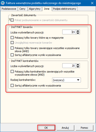 InsTYNKT to mechanizm wyszukiwania asortymentu i kontrahentów (w przypadku faktur wewnętrznych) w bazie, pozwalający ograniczyć korzystanie z pełnych list dostępnych pod przyciskiem F2. Aby zmienić konfigurację dla faktury wewnętrznej podatku naliczonego do nieistniejącego, należy: