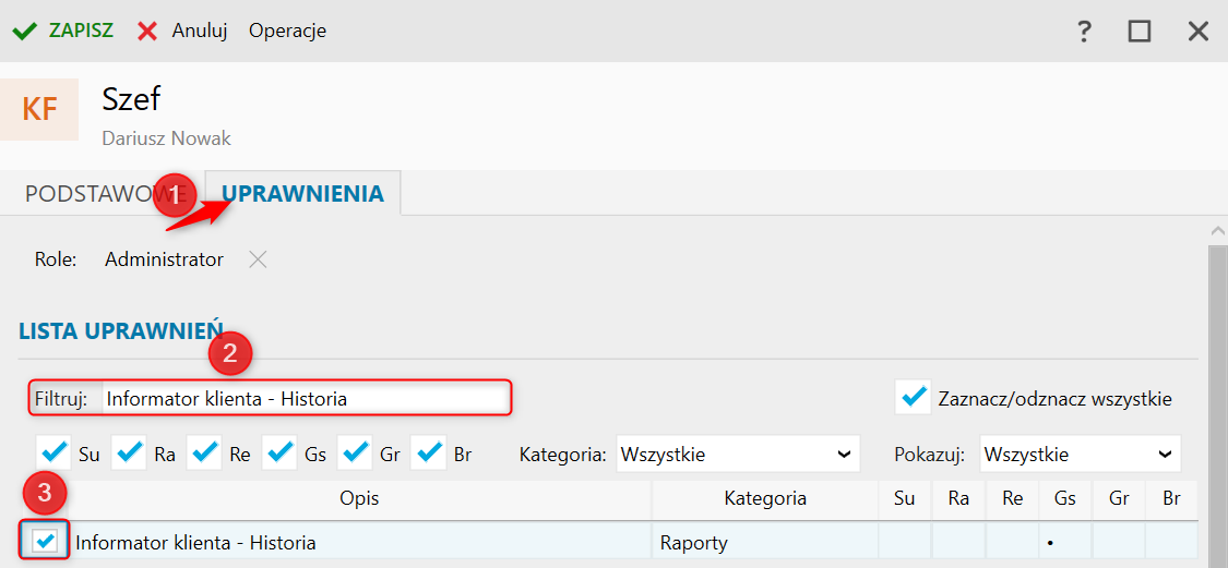 2. Przejść na zakładkę Uprawnienia, w Filtruj wpisać Informator klienta – Historia, a następnie odznaczyć znacznik przy wybranym uprawnieniu. Zmiany zatwierdzić przyciskiem Zapisz.