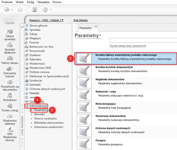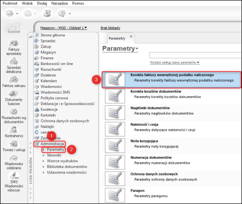 1. Przejść do modułu Administracja – Parametry i otworzyć Korekta faktury wewnętrznej podatku naliczonego.