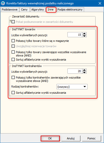 InsTYNKT to mechanizm wyszukiwania asortymentu i kontrahentów (w przypadku korekt faktur wewnętrznych) w bazie, pozwalający ograniczyć korzystanie z pełnych list dostępnych pod przyciskiem F2. Aby zmienić konfigurację dla korekty faktury wewnętrznej podatku naliczonego, należy: