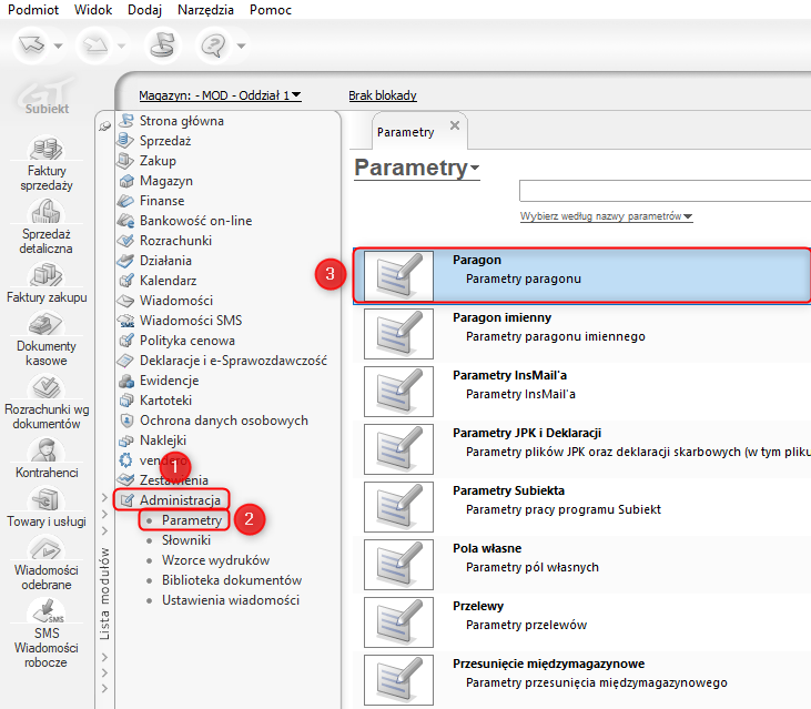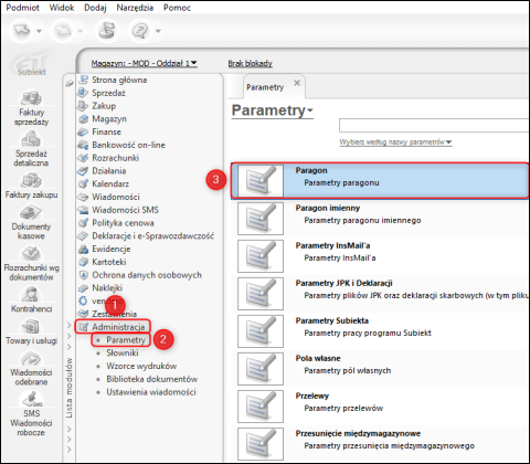 1. Przejść do modułu Administracja – Parametry i otworzyć Paragon.