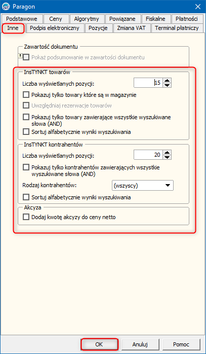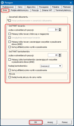 InsTYNKT to mechanizm wyszukiwania asortymentu i kontrahentów (w przypadku paragonów) w bazie, pozwalający ograniczyć korzystanie z pełnych list dostępnych pod przyciskiem F2. Aby zmienić konfigurację dla paragonów, należy: