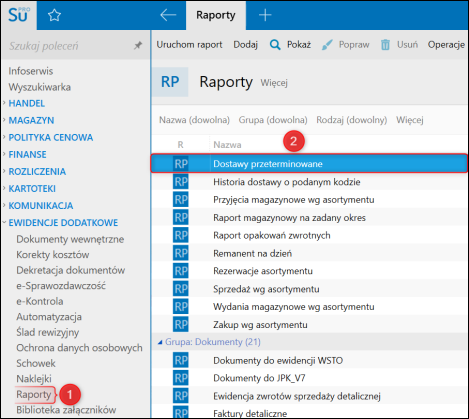 1. Przejść do modułu Ewidencje dodatkowe ​ Raporty i wybrać Dostawy przeterminowane.