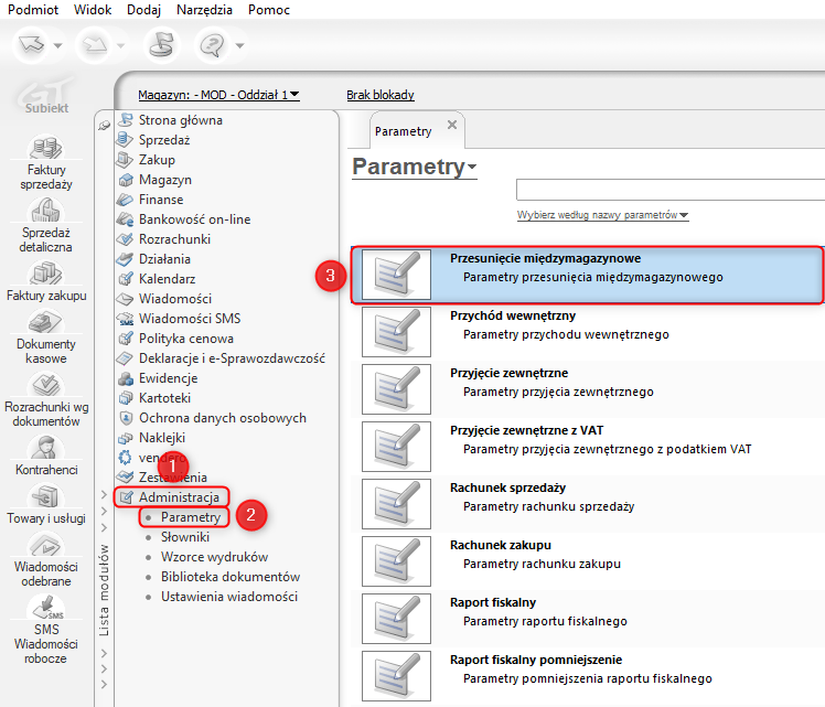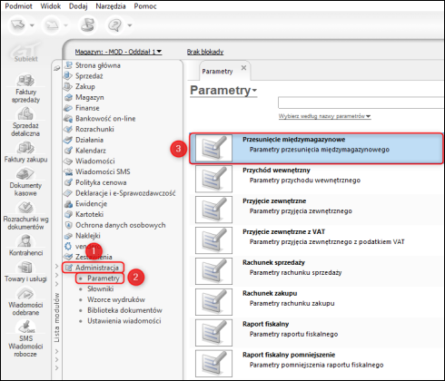 1. Przejść do modułu Administracja – Parametry i otworzyć Przesunięcie międzymagazynowe.