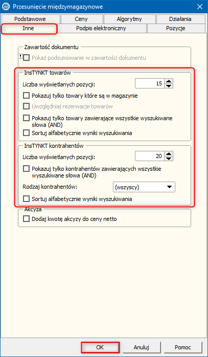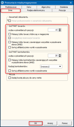InsTYNKT to mechanizm wyszukiwania asortymentu i kontrahentów (w przypadku dokumentów magazynowych) w bazie, pozwalający ograniczyć korzystanie z pełnych list dostępnych pod przyciskiem F2. Aby zmienić konfigurację dla przesunięć międzymagazynowych, należy: