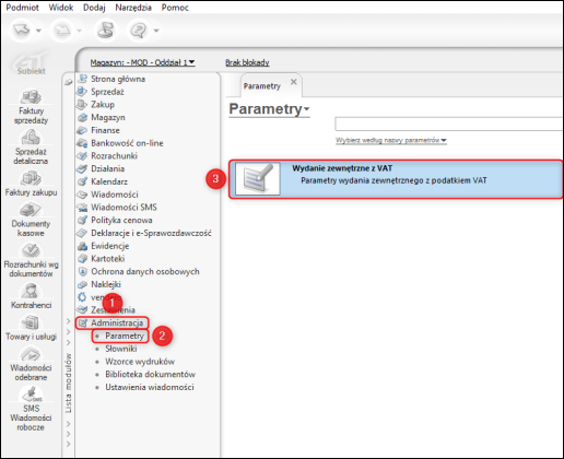 1. Przejść do modułu Administracja – Parametry i otworzyć Wydanie zewnętrzne z VAT.
