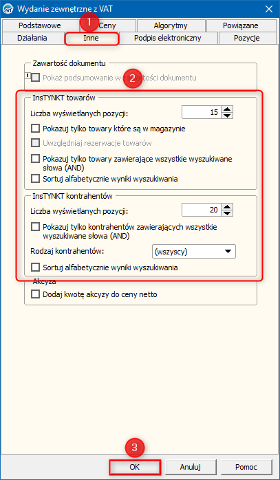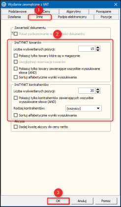 InsTYNKT to mechanizm wyszukiwania asortymentu i kontrahentów (w przypadku dokumentów magazynowych) w bazie, pozwalający ograniczyć korzystanie z pełnych list dostępnych pod przyciskiem F2. Aby zmienić konfigurację dla wydań zewnętrznych z VAT, należy: