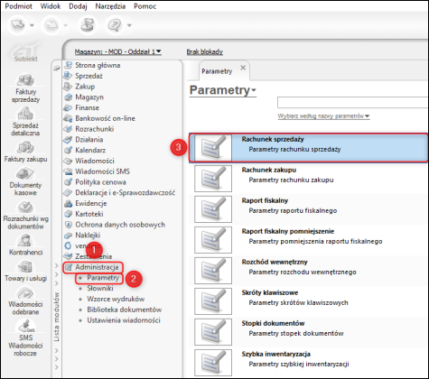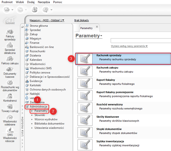 1. Przejść do modułu Administracja – Parametry i otworzyć Rachunek sprzedaży.
