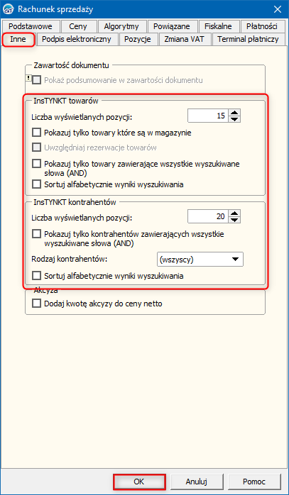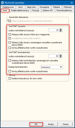 InsTYNKT to mechanizm wyszukiwania asortymentu i kontrahentów (w przypadku rachunków) w bazie, pozwalający ograniczyć korzystanie z pełnych list dostępnych pod przyciskiem F2. Aby zmienić konfigurację dla rachunków sprzedaży, należy: