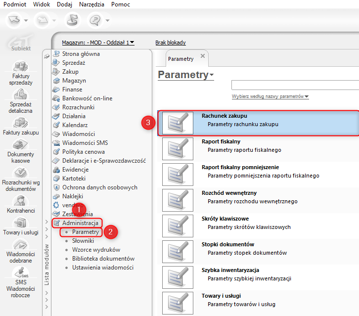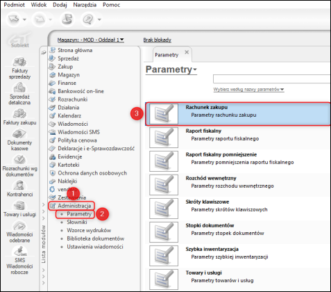 1. Przejść do modułu Administracja – Parametry i otworzyć Rachunek zakupu.