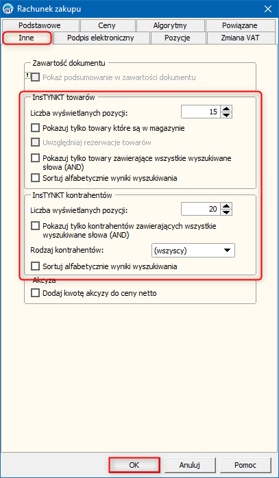 InsTYNKT to mechanizm wyszukiwania asortymentu i kontrahentów (w przypadku rachunków) w bazie, pozwalający ograniczyć korzystanie z pełnych list dostępnych pod przyciskiem F2. Aby zmienić konfigurację dla rachunków zakupu, należy: