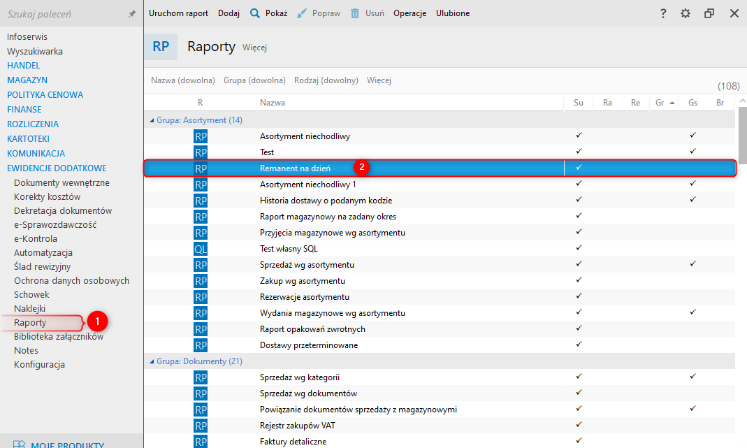 1. Przejść do modułu Ewidencje dodatkowe –​ Raporty i wybrać Remanent na dzień.