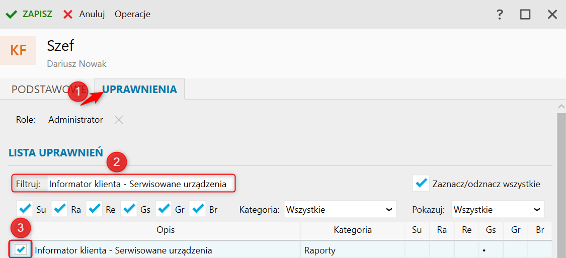 2. Przejść na zakładkę Uprawnienia, w Filtruj wpisać Informator klienta – Serwisowane urządzenia, a następnie odznaczyć znacznik przy wybranym uprawnieniu. Zmiany zatwierdzić przyciskiem Zapisz.