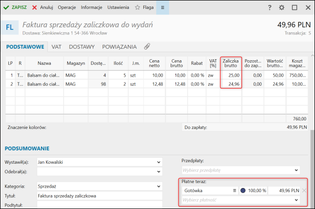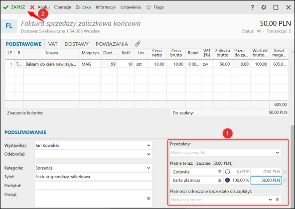 UWAGA!! Na fakturze zaliczkowej końcowej nie będzie widoczny asortyment, który został dodatkowo wydany, po​nieważ został on już opłacony oraz zafakturowany fakturą zaliczkową do WZ.