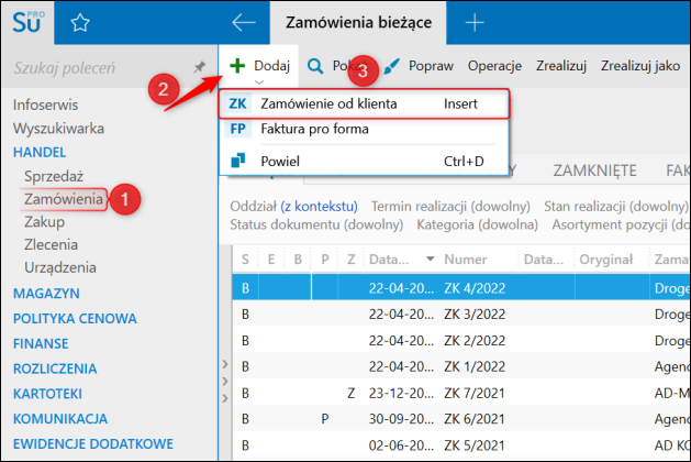 1. Przejść do modułu Zamówienia, następnie kliknąć górne menu Dodaj – Zamówienie od klienta.