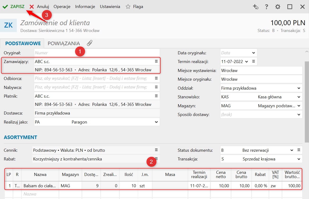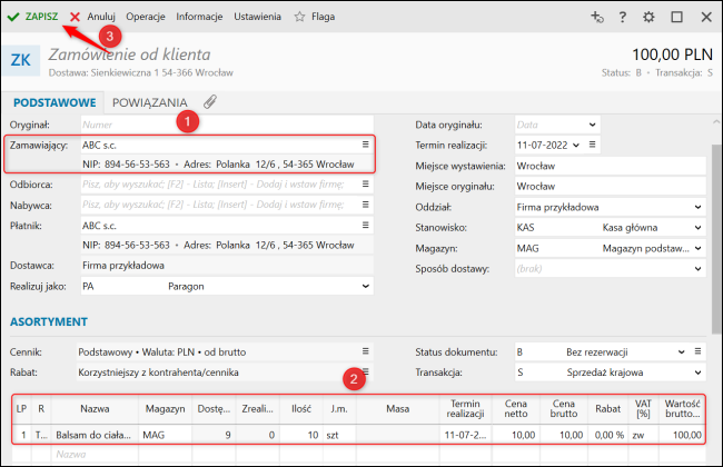2. Wskazać Zamawiającego oraz wprowadzić zamawiany Asortyment. Zapisać zamówienie.