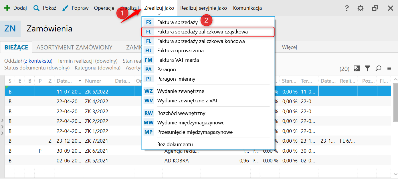 3. Kolejnym krokiem jest wprowadzenie faktury zaliczkowej, która potwierdza wpłatę zaliczki. W tym celu należy zaznaczyć zamówienie, następnie kliknąć górne menu Zrealizuj jako – Faktura sprzedaży zaliczkowa cząstkowa.