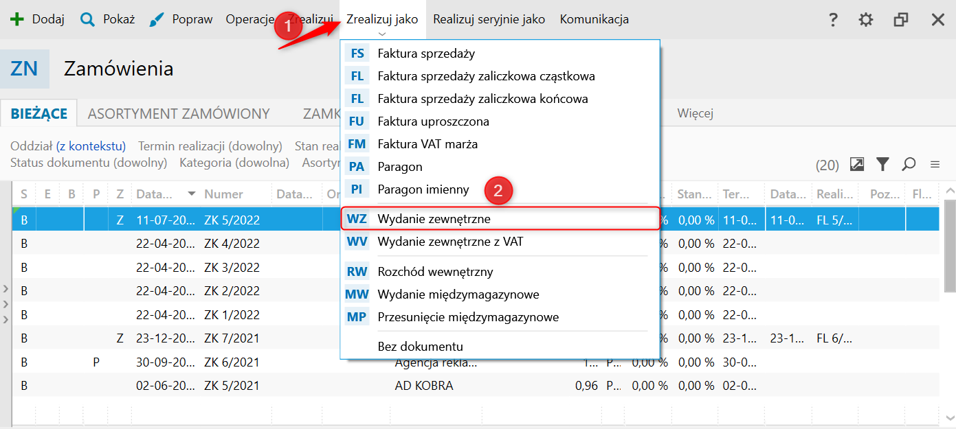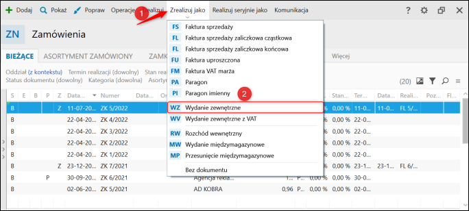 5. W celu wydania towaru należy ponownie zaznaczyć zamówienie oraz kliknąć górne menu Zrealizuj jako - Wydanie zewnętrzne.
