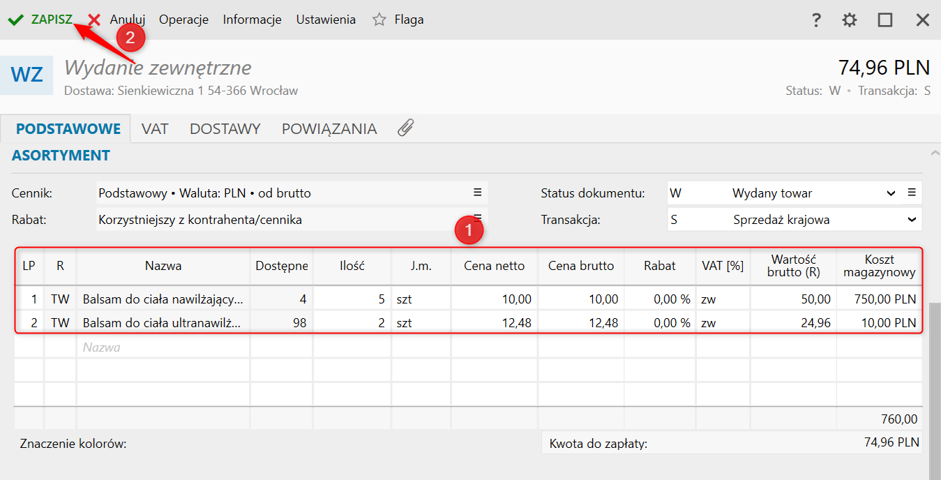 6. Program automatycznie podpowie taką ilość towarów do wydania, jaka została opłacona, dlatego ręcznie należy wprowadzić większą wartość oraz wydać dodatkowy towar, o który poprosił klient i Zapisać dokument.