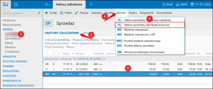 7. W celu zafakturowania dodanego dokumentu wydania zewnętrznego należy przejść do modułu Sprzedaż, na zakładce Faktury zaliczkowe, odnaleźć odpowiedni Dokument zaliczkowy do zamówienia, zaznaczyć dokument WZ, następnie kliknąć górne menu Wystaw – Faktura sprzedaży zaliczkowa końcowa.