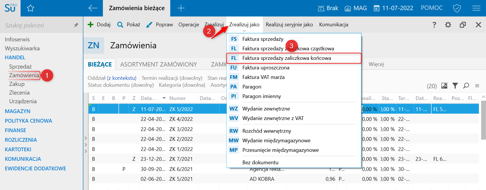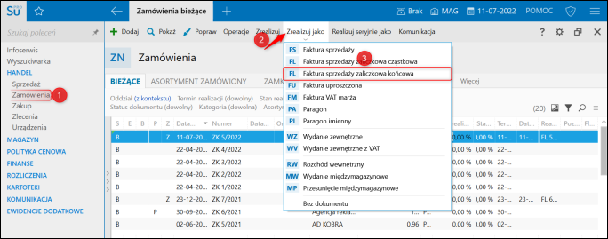 9. W celu wydania reszty towaru oraz pełnej realizacji zamówienia należy przejść do modułu Zamówienia, zaznaczyć zamówienie, następnie kliknąć górne menu Zrealizuj jako – Faktura sprzedaży zaliczkowa końcowa.