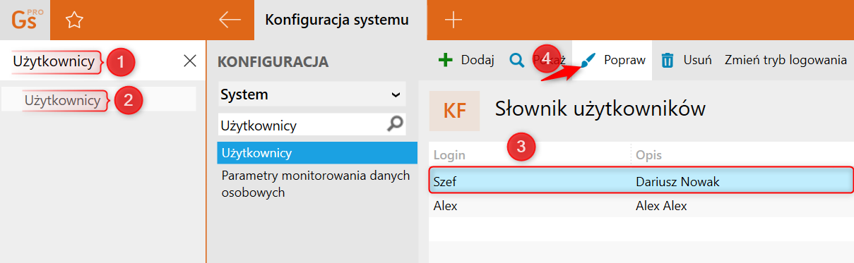 1. W wyszukiwarce wpisać Użytkownicy, a następnie wskazać użytkownika i użyć opcji Popraw.