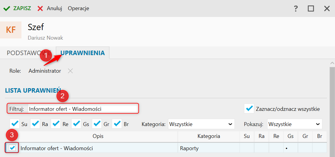 2. Przejść na zakładkę Uprawnienia, w Filtruj wpisać Informator ofert – Wiadomości, a następnie odznaczyć znacznik przy wybranym uprawnieniu. Zmiany zatwierdzić przyciskiem Zapisz.
