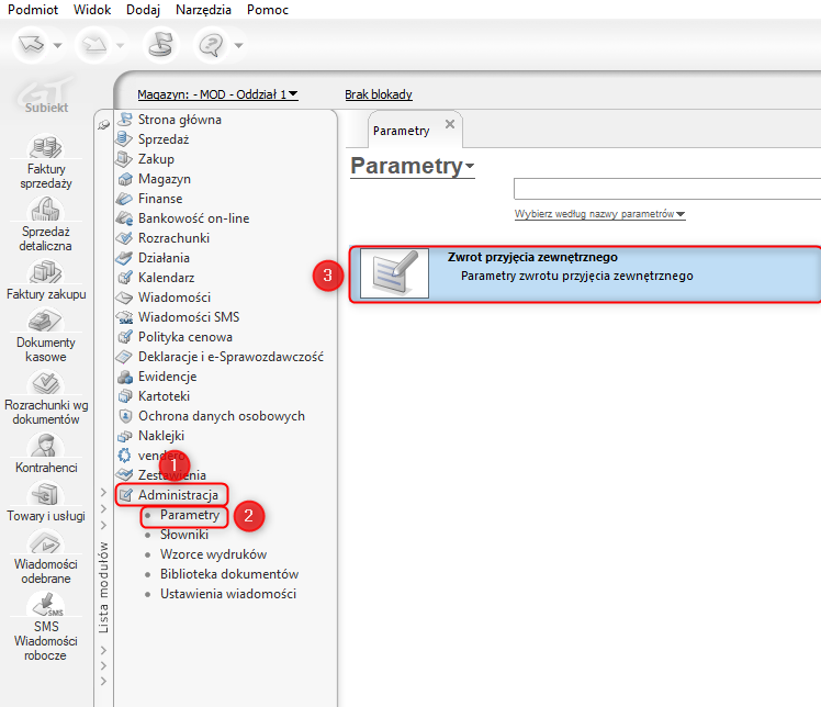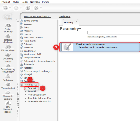 1. Przejść do modułu Administracja – Parametry i otworzyć Zwrot przyjęcia zewnętrznego.