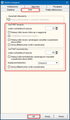 InsTYNKT to mechanizm wyszukiwania asortymentu i kontrahentów (w przypadku zwrotów) w bazie, pozwalający ograniczyć korzystanie z pełnych list dostępnych pod przyciskiem F2. Aby zmienić konfigurację dla zwrotów przyjęć zewnętrznych, należy: