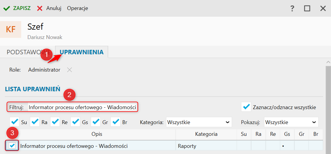 2. Przejść na zakładkę Uprawnienia, w Filtruj wpisać Informator procesu ofertowego – Wiadomości, a następnie odznaczyć znacznik przy wybranym uprawnieniu. Zmiany zatwierdzić przyciskiem Zapisz.