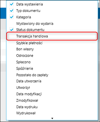 3. Rozwinąć filtr Transakcja handlowa i wybrać te transakcje, według których mają być filtrowane dokumenty.